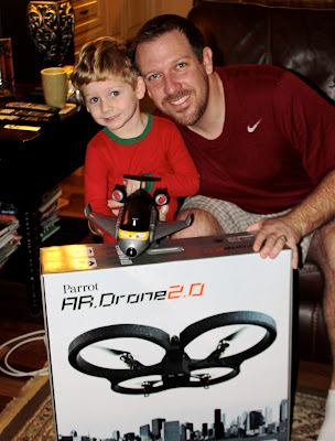 Then he and Daddy opened their gift from Grandpa E. He got them a really advanced AR Drone helicopter. It's pretty massive and does so much more than fly. You control it with an app on your phone and it even records video as it's flying. The boys LOVED it!
